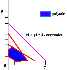 Řešení úlohy LP nyní můžeme zformulovat takto - "Nalezněte maximální hodnotu d, pro kterou má přímka, určená rovnicí 4.1.2.1 neprázdný průnik s polyedrem, určeným omezujícími podmínkami úlohy."